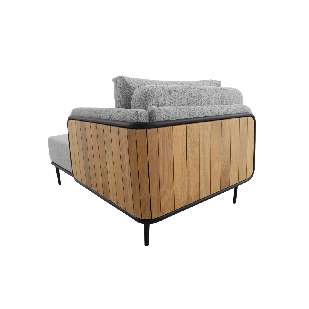 A Chaise Cayman combina requinte e funcionalidade em um design contemporâneo. Sua estrutura em alumínio tubular com pintura eletrostática é harmonizada por detalhes laterais em madeira Freijó. O assento em espuma, revestido em tecido repelente a líquidos, proporciona conforto e resistência para momentos de relaxamento.